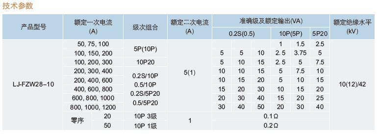 八、FZW28隔離負荷開關用高壓零序計量保護一體式電流互感器LJFZW28-10技術參數